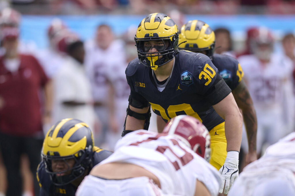 NCAA, College League, USA Football 2024: Michigan vs Alabama ReliaQuest Bowl DEC 31 December 31, 2024: Michigan linebacker Jimmy Rolder 30 on defense during an NCAA football game between the Michigan Wolverines and Alabama Crimson Tide at Raymond James Stadium in Tampa, Florida. Mike Janes/CSMCredit Image: Â Mike Janes/Cal Media Tampa Florida United States EDITORIAL USE ONLY Copyright: xx ZUMA-20241231_faf_c04_080.jpg MikexJanesx csmphotothree340185